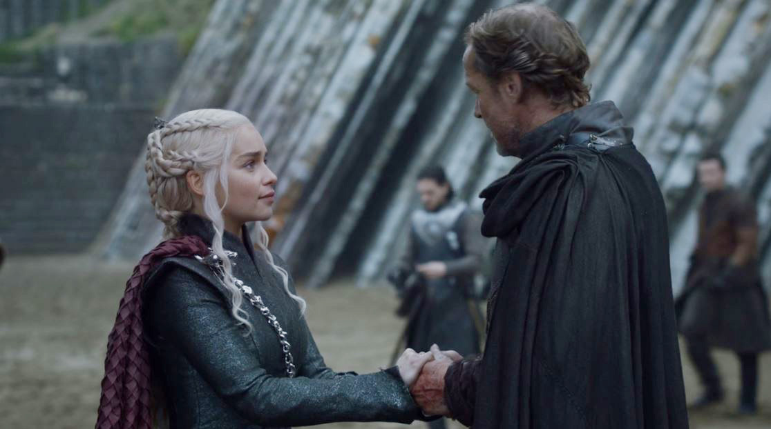 Daenerys mostra seu lado cruel e dona da bola. Ou é do jeito dela, ou você morre queimado, não importa se você é um nobre respeitado que lutou com honra. Pra que tentar ganhar a lealdade dessa galera, né? Pelo menos o Sam não precisa mais devolver a Veneno do Coração para o pai.