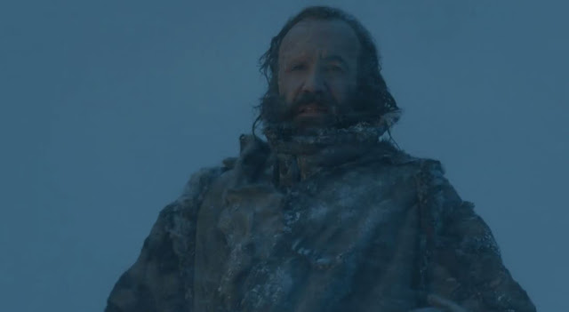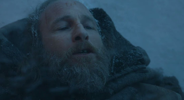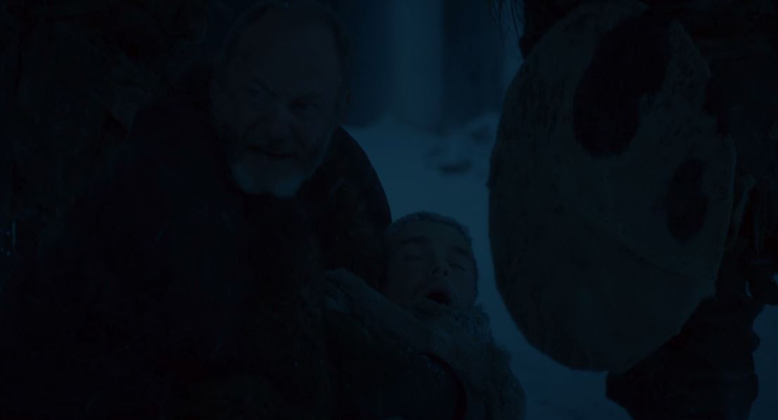 Benjen Stark, em sua versão “zumbi-lúcido”, aparece para salvar Jon, e se sacrifica de uma vez por todas para que o sobrinho possa sobreviver e voltar à Muralha, onde Daenerys o espera.