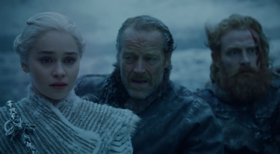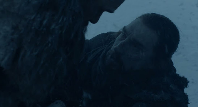 E no navio de volta para Pedra do Dragão, Jon finalmente diz que irá se ajoelhar perante ela, ou seja, colocará o Norte sob o domínio da dinastia Targaryen mais uma vez. Ao fazer o que Mance Rayder não fez, Jon abdica de seu orgulho, e possivelmente sofrerá com a perda do respeito de alguns de seus vassalos nortenhos, mas está poupando muitas vidas (que lutariam nessa guerra), além de firmar a poderosa aliança que vai lutar contra a ameaça dos Caminhantes Brancos e do inverno.