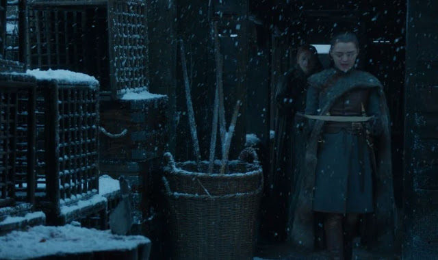 Sansa explica que foi obrigada pelos Lannisters a escrever a famigerada mensagem (que foi encontrada por Arya no episódio passado), afinal ela era apenas uma criança e estava vulnerável aos inimigos, mas Arya ignora e recomeça seu discurso sobre Sansa ser fraca, estúpida e fútil.