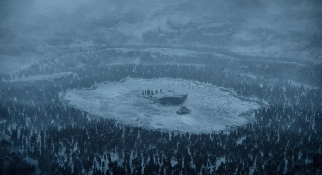 Em contrapartida, os Caminhantes Brancos e seus zumbis esperam nas bordas do lago congelado, no centro do qual a comitiva se isolou. Ainda que os zumbis não pudessem caminhar na superfície do lago sem quebrá-la, eles poderiam atirar lanças, flechas ou pedras. Mas não, eles esperam pacientemente. O Rei da Noite já esperou 8 mil anos desde a última Longa Noite, o que seriam mais algumas horas, não é mesmo? É quase como se ele já soubesse que Dany viria com os três dragões (não faria sentido nenhum ele saber, mas vai que ele tem uns poderes de visão como o Bran, né? Sei lá…).