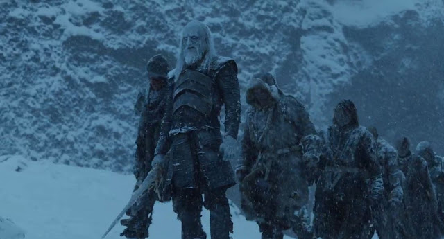 Aparece um grupo de zumbis liderado por um caminhante branco, e quando Jon o mata, fica sugerido que zumbis caem quando se mata o caminhante que os ergueu. Isso é uma informação super relevante para o roteiro, pois se a mesma relação existir entre o caminhante branco e o outro caminhante que o criou, todos eles estariam ligados por uma poderosa teia (como as relações de sangue entre vampiros), e a guerra poderia acabar com um único golpe que matasse o Rei da Noite.